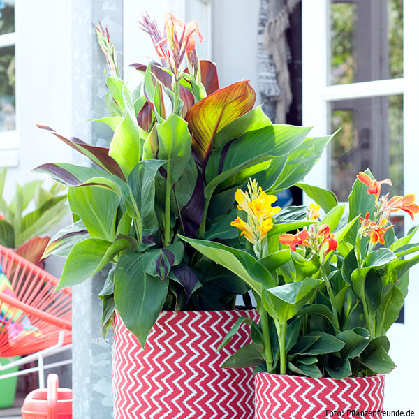 Einen tropischen Mitbewohner bekommen Sie mit dem Blumenrohr (Canna). Die Pflanze blüht ab Juni in Rot, Gelb, Orange oder sogar zweifarbig und kann eine Höhe von bis zu 2 m erreichen. In Asien gibt es sogar essbare Sorten. Gegessen werden die Rhizome, deren Geschmack an Süßkartoffeln erinnert. Sie bevorzugt einen sonnigen, jedoch vor Wind geschützten Standort, damit ihre bis zu 15 cm großen Blüten nicht abknicken. Die Canna kommt ursprünglich aus Südamerika und von den karibischen Inseln. Gießen Sie regelmäßig und entfernen Sie dabei Verblühtes. Staunässe und Trockenheit sind zu vermeiden.