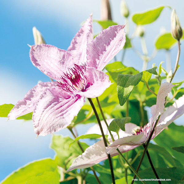 Ein „Juwel im Garten“ oder „umwerfende Schönheit“ darf sich auch die Waldrebe (Clematis) aufgrund ihrer reizvollen Blüten nennen. Die Wurzeln der Waldrebe mögen es kühl, darum sollte der untere Teil der Pflanze nie voll in der Sonne stehen. Der obere Teil der meisten Arten mag es hingegen eher hell und sonnig. Die Blütezeit startet, je nach Sorte, bereits ab Mai und zieht sich bis in den September. Die Waldrebe ist das perfekte Mitbringsel für all diejenigen, die nur wenig Platz für Pflanzen zur Verfügung haben. Die fast auf der ganzen Welt beheimatete Kletterpflanze strebt nämlich lieber in die Höhe und weniger in die Breite. Selbst in einem Balkonkasten mit einer Rankhilfe fühlt sie sich pudelwohl.