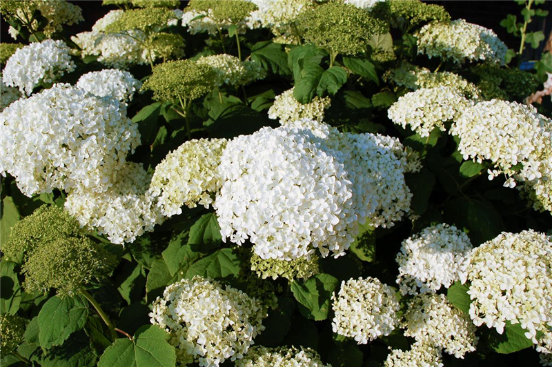 Mit kugeligen Blütenbällen ist die Ballhortensie 'Annabelle' (Hydrangea arborescens) der Star im Garten. Diese Hortensie zählt zu den schönsten ihrer Sorte. Ihre großen Pom-pons mit einem Durchmesser von 20 bis 25 cm erstrahlen ab Juni erst grünlich und später in einem reinen Weiß.