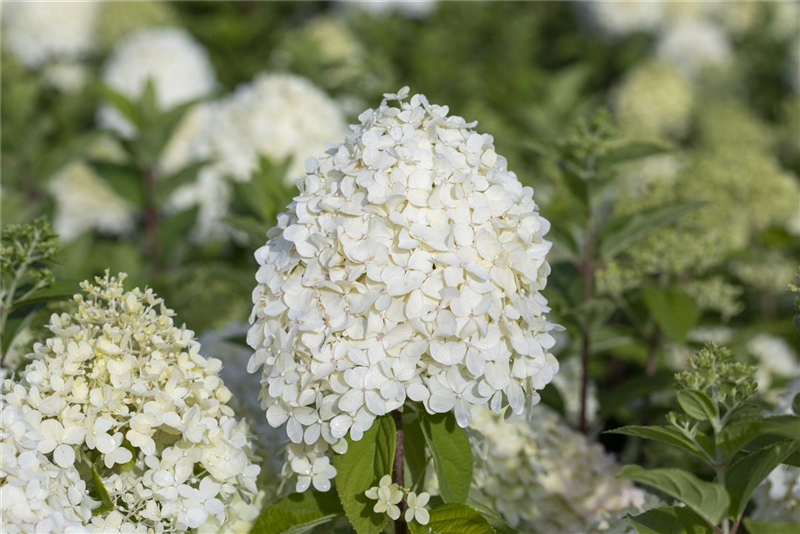 Für halbschattige, frische bis feuchte Standorte ist die Rispenhortensie (Hydrangea paniculata) ebenfalls die richtige Wahl. Sie kann eine Wuchshöhe von bis zu 4 m erreichen und blüht meist in Cremeweiß, wobei sich die Farbe jedoch im Verblühen oft ins Rosafarbene verändert. Die verschiedenen Sorten blühen unterschiedlich, viele sogar erst ab August. Die Rispenhortensie mit ihren kegelförmigen Blüten verträgt im Gegensatz zu den anderen Hortensien kürzere Trockenzeiten gut.