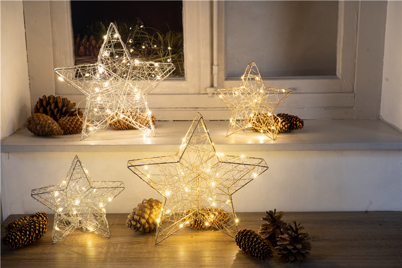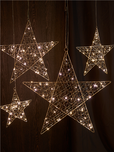 Die Leuchtsterne aus Metall und Gold erstrahlen mit vielen kleinen LED-Lichtern. In unterschiedlichen Größen können Sie einzeln oder auch als Sternenfamilie platziert werden und geben Ihren Räumen eine Extraportion Glitzer.