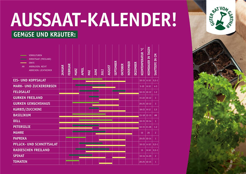 Schauen Sie gern den Aussaatkalender für Gemüse und Kräuter: